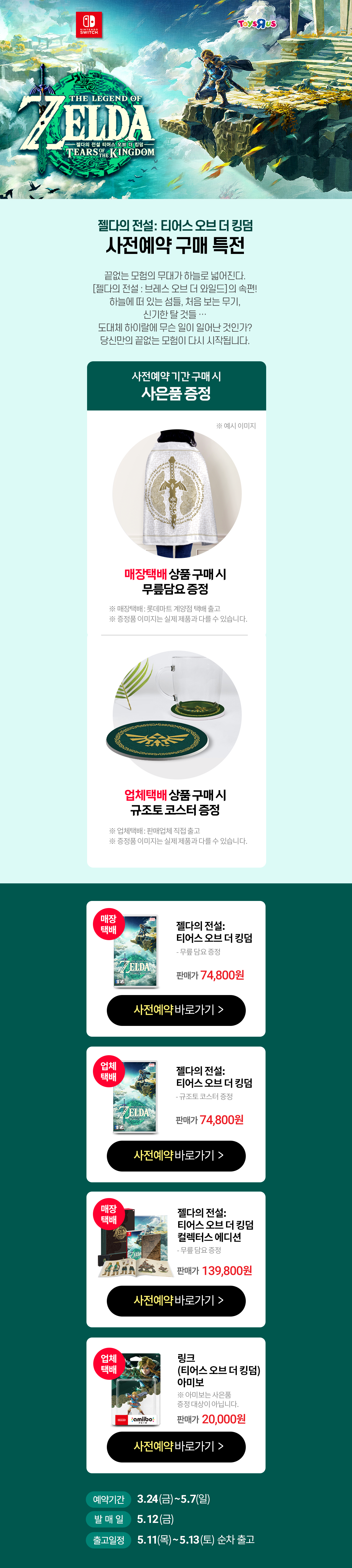Web 금일 공개된 젤다의 전설 티어스 오브 더 킹덤 왕국의 눈물의 한정판 발매 소식은 여기까지입니다.